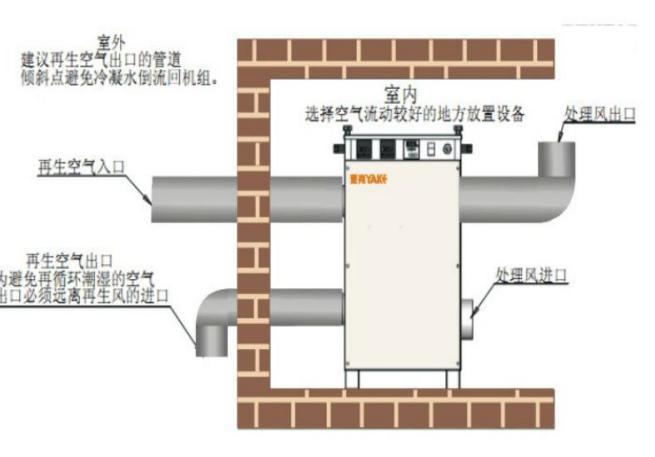 除濕機置于室外:干空氣出口和處理空氣進口連接到除濕區(qū)域。再生風入口和濕空氣出口不需要連 接管道。