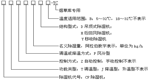 型號示例: CFZF20-YC 表示名義除濕量為20kg/h,進風溫度18~32℃,固定式自動調溫型煙草庫專用除濕機組。