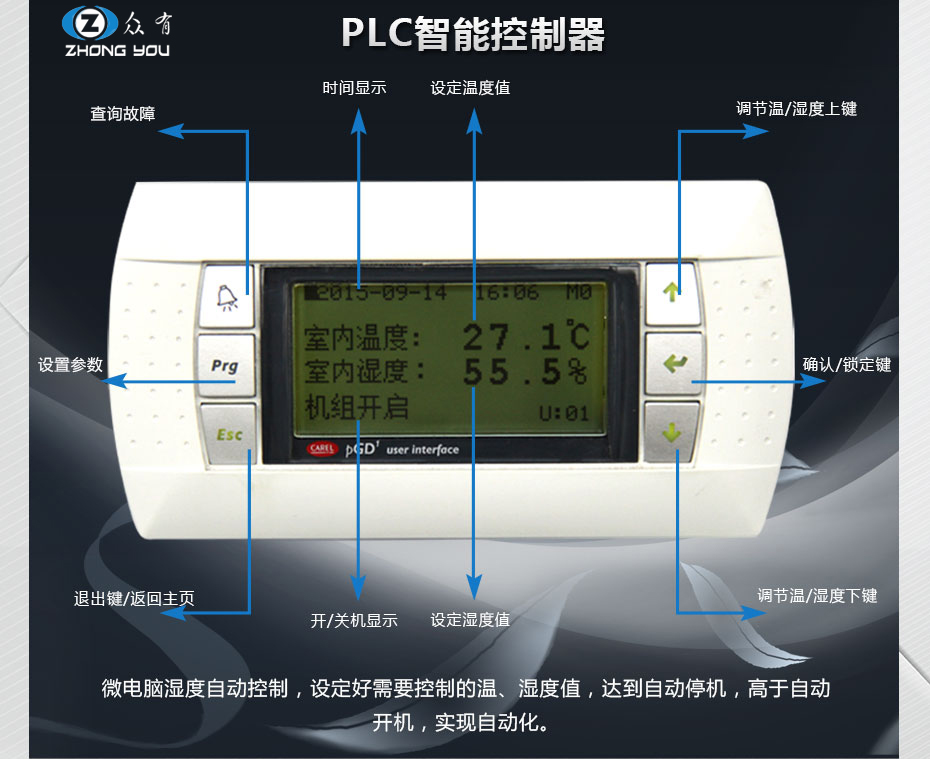 機組采用了專用的微電腦控制,可根據用戶設定的相對濕度自動啟停、精度高、可靠性好、外形美觀、操作簡便。